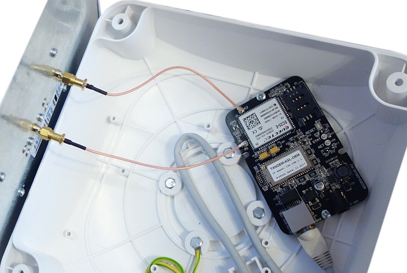 Совмещение роутера и внешней антенны в одном корпусе позволяет свести затухание сигнала в соединительных коаксиальных кабелях до нуля, поскольку в такой конфигурации в качестве кабеля спуска используется обычный Ethernet-кабель (витая пара), который передает информацию практически без потерь. Длина Ethernet-кабеля может достигать 50 и более метров, что обеспечивает возможность установки комплекта на максимальной доступной высоте или в точке с наилучшим приемом.