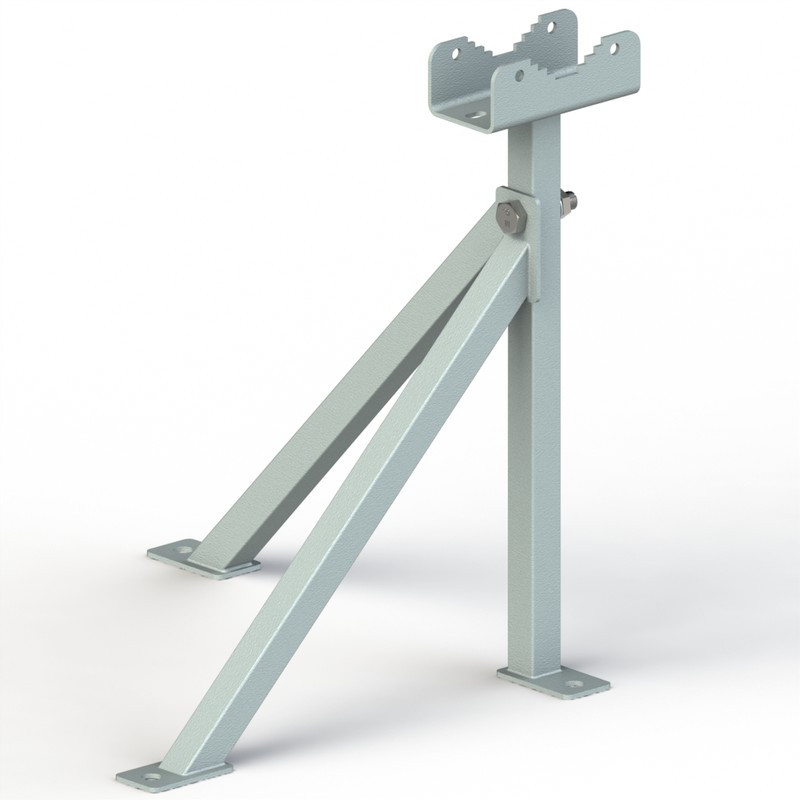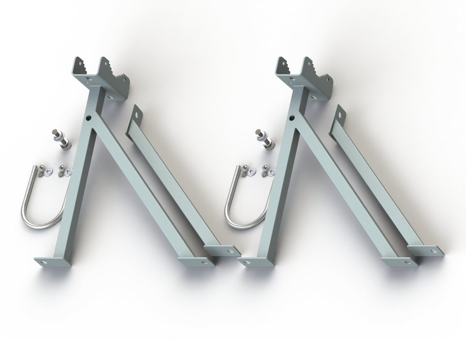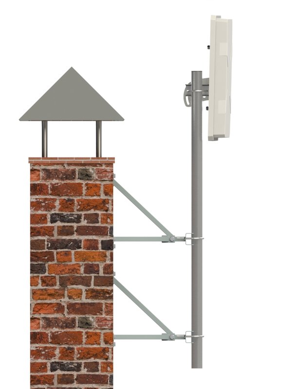 Кронштейн состоит из двух узлов, каждый из которых имеет по три точки крепления к стене, за счет чего достигается максимальная жесткость. Мачта захватывается двумя универсальными зубчатыми креплениями и двумя U-болтами (М6). Возможно крепление мачт диаметром 25-52 мм.