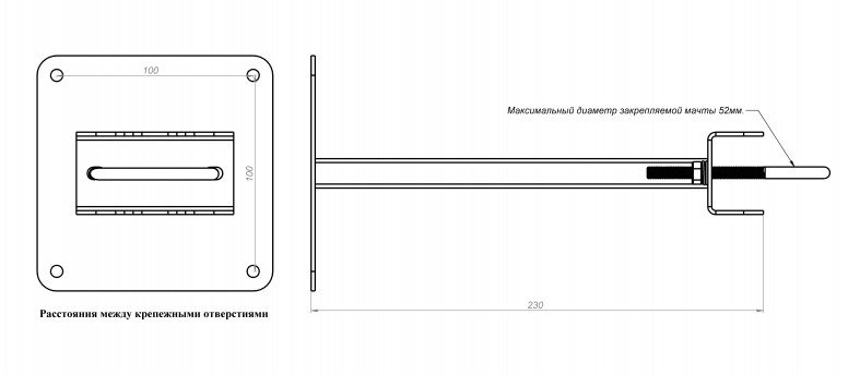 Кронштейн KSM-200 предназначен для крепления антенных мачт диаметром ∅25-52 мм к стенам зданий с выносом от стены 200 мм. Расстояние между крепежными отверстиями на площадке крепления к стене – 100мм.