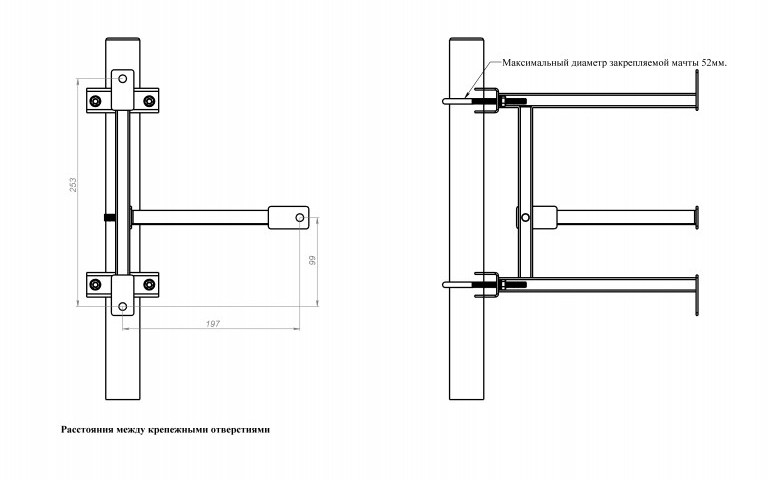 При небольшой длине мачты и малой парусности антенны, можно обойтись без дополнительных растяжек мачты. В качестве мачты можно использовать любые подходящие по диаметру металлические трубы. Мачта захватывается двумя универсальными зубчатыми креплениями и двумя U-болтами (М6). Возможно крепление мачт диаметром 25-52 мм.
