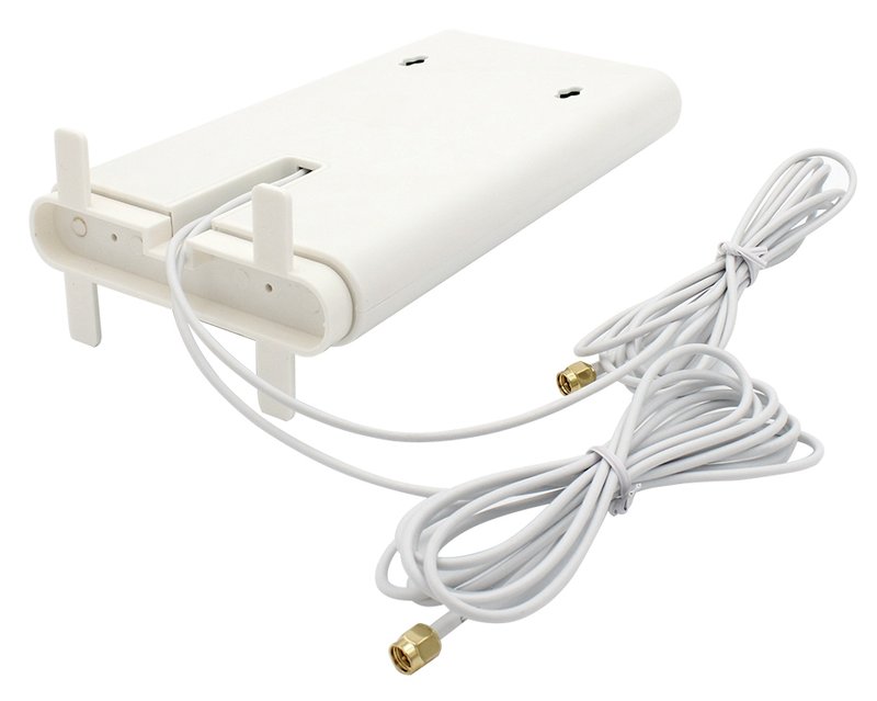 Антенна имеет два кабеля длиной 1,9 метра с двумя разъемами SMA-male на концах для реализации технологии MIMO. Крепится или устанавливается с помощью комплектной подставки.