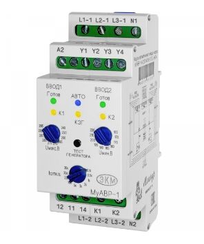 Модуль МУАВР-1 контролирует параметры трехфазной четырехпроводной сети с нейтралью (ввод1 подключается к L1-1, L2-1, L3-1, N1, ввод2 подключается к L1-2, L2-2, L3-2, N2), или однофазной сети (ввод1 подключается к L1-1 и N1, ввод2 подключается к L1-2 и N2), Модуль имеет светодиодную индикацию текущего состояния сети. Питание осуществляется от контролируемой сети. Оба ввода гальванически развязаны между собой. Управление КМ осуществляется путем подачи напряжения с L1-1 на К1 для включения Ввод1 и с L1-2 на К2 для включения Ввод2.