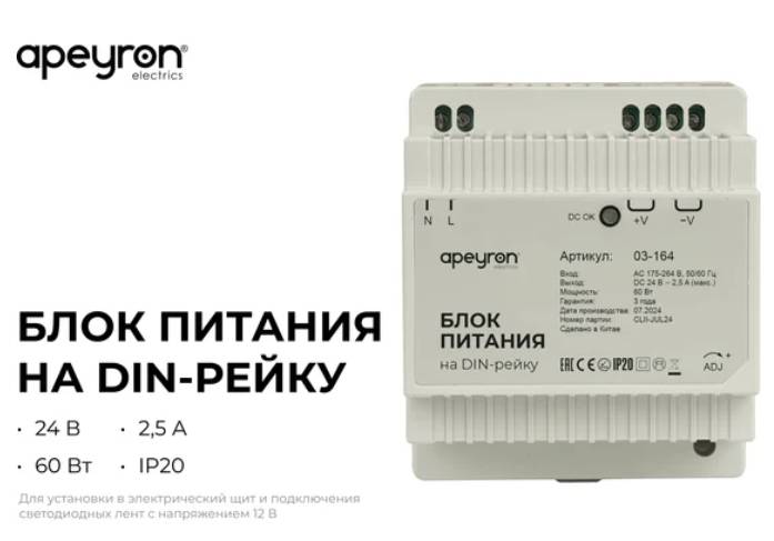 Блок питания на DIN-рейку 24V 60W 175-264V 2,5А IP20 78х93х56мм APEYRON 03-164