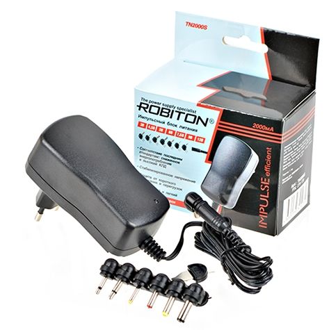 ROBITON TN2000S — импульсный блок питания 2000 мА. Предназначен для питания от источника переменного тока 100-240 В приборов с напряжением 3,0 / 4,5 / 5 / 6 / 7,5 / 9,0 / 12,0 В и максимальным входным током 2000 мА. Набор из 7 наиболее распространенных входных насадок и выбор полярности позволяют использовать его для питания большого количества современных электроприборов, цифровых устройств, устройств автоматики и др. Автоматическая  защита от короткого замыкания и защита от перегрузок.