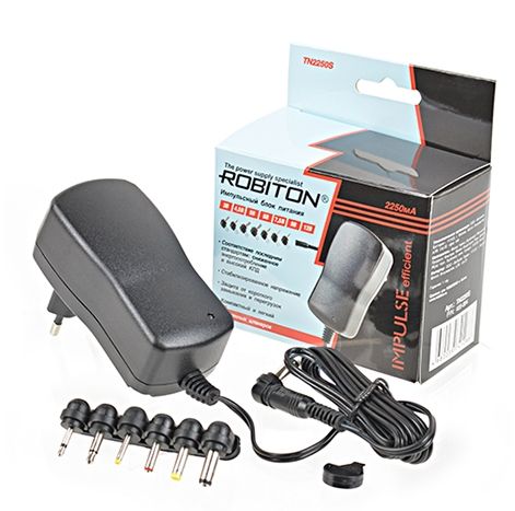 ROBITON TN2250S — импульсный блок питания 2250 мА. Предназначен для питания от источника переменного тока 100-240 В приборов с напряжением 3,0 / 4,5 / 5 / 6 / 7,5 / 9,0 / 12,0 В и максимальным входным током 2250 мА. Набор из 7 наиболее распространенных входных насадок и выбор полярности позволяют использовать его для питания большого количества современных электроприборов, цифровых устройств, устройств автоматики и др. Автоматическая защита от короткого замыкания и защита от перегрузок.