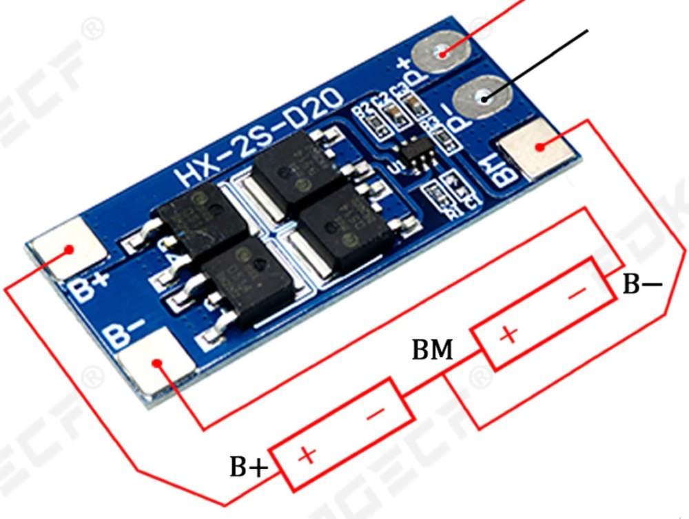 Модуль защиты для 2-х LiIo/LiPo аккумуляторов HX-2S-D20 соединенных последовательно. Этот модуль защищает литий-ионные аккумуляторы, сконфигурированных в 2S от чрезмерной зарядки и разрядки, защищает батареи от короткого замыкания и перегрузок по току разряда, ограничивая максимальный ток значением в 20 А. Этот модуль не является зарядным устройством!