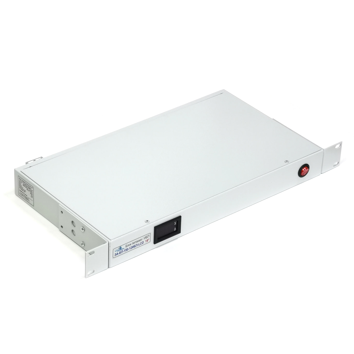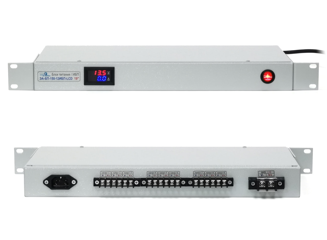 Блок питания с функцией ИБП для установки в 19" стойки и шкафы. Устанавливается в стойки 19" и занимает 1U. Максимально допустимый ток нагрузки 12,5 А (мощность нагрузки 150 Вт.). На задней части прибора располагаются клеммы для подключения нагрузки и аккумуляторных батарей.