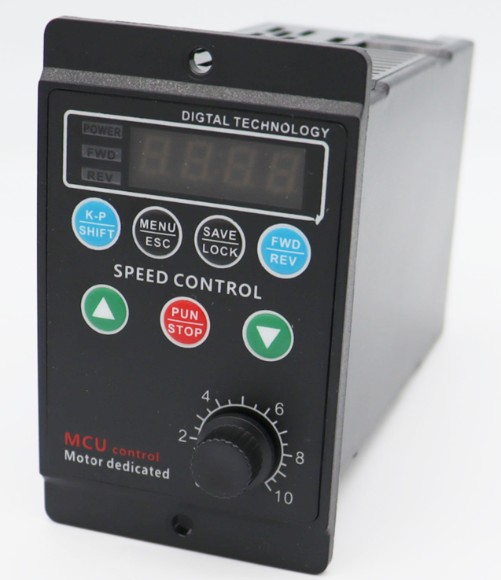 • элементы индикации текущего состояния (светодиодные индикаторы направления вращения двигателя и останова (FWD, REV, POWER), а также цифровой дисплей для отображения скорости и настройки параметров работы;