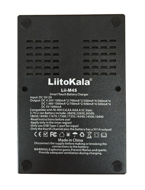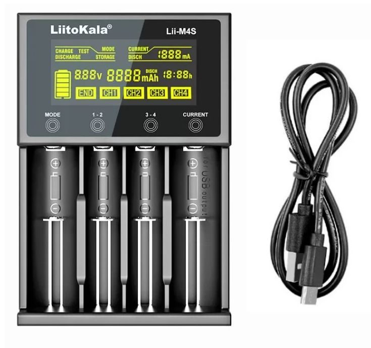 LiitoKala Lii-M4S - позволяет заряжать, разряжать, тестировать, готовить к длительному хранению от одного до четырех Ni-Cd, Ni-MH и Li-Ion аккумуляторов формата AA, AAA, C, 10440, 14500, 14650, 16340, 17335, 17500,17670,18490,18650,21700,22650,26650.