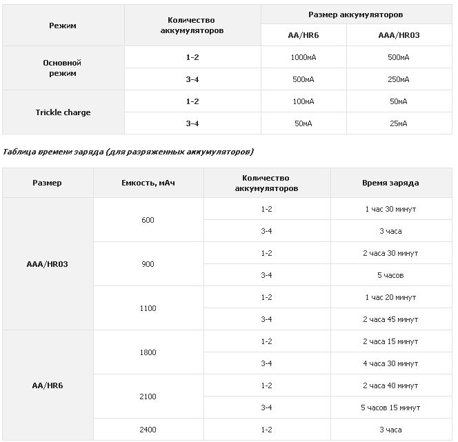 Кол-во одновременно заряжаемых АА 1 / 4 / 3 / 2