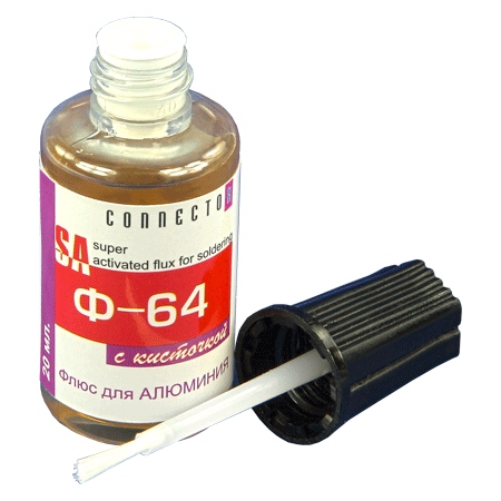 Фюс для пайки алюминия Ф-64 20 мл. Connector ФАП-20 служит для пайки алюминия и лёгких металлов. Большое колличество смачивающих компонетов обеспечивает глубокое проникновение флюса.