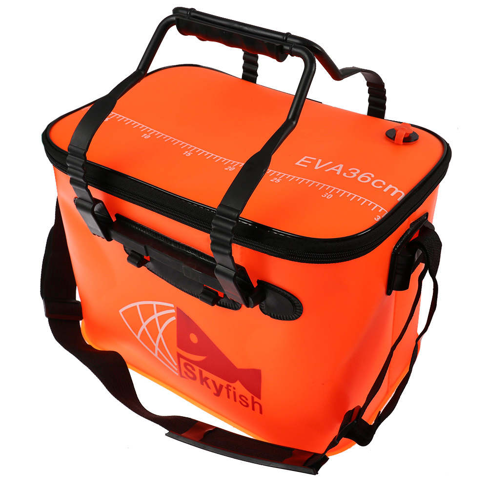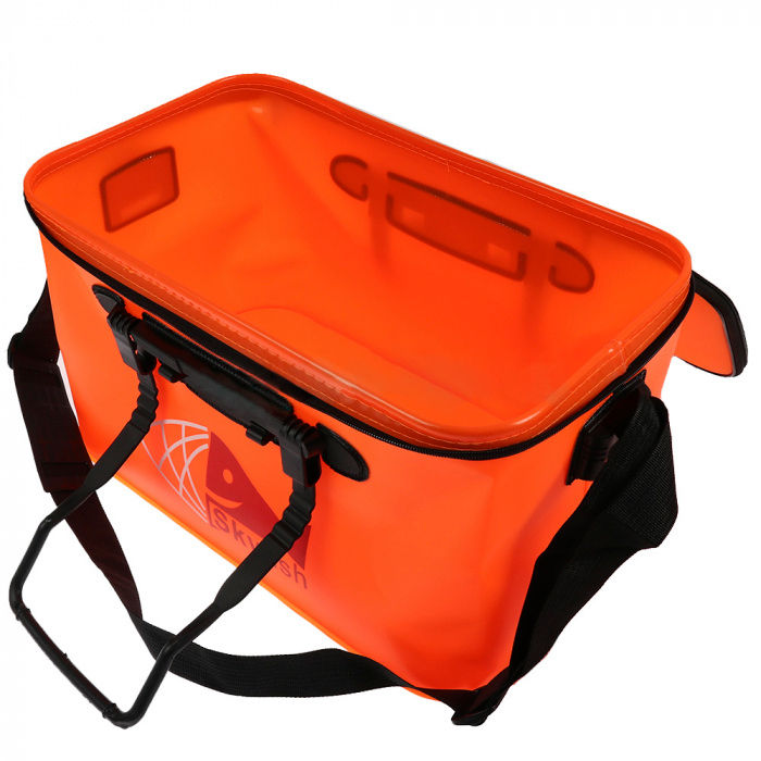 Изготовлена из материала ЭВА, который устойчив к разрыву и истиранию. Вентиляционное отверстие на крышке помогает улучшить поток воздуха для рыб. Удобная линейка поможет узнать размер пойманного трофея. Двухсторонняя застежка-молния легко открывает или закрывает сумку. Регулируемый плечевой ремень и ручка обеспечивают удобную переноску. Сумка складывается в компактный размер для удобного хранения и перевозки.
