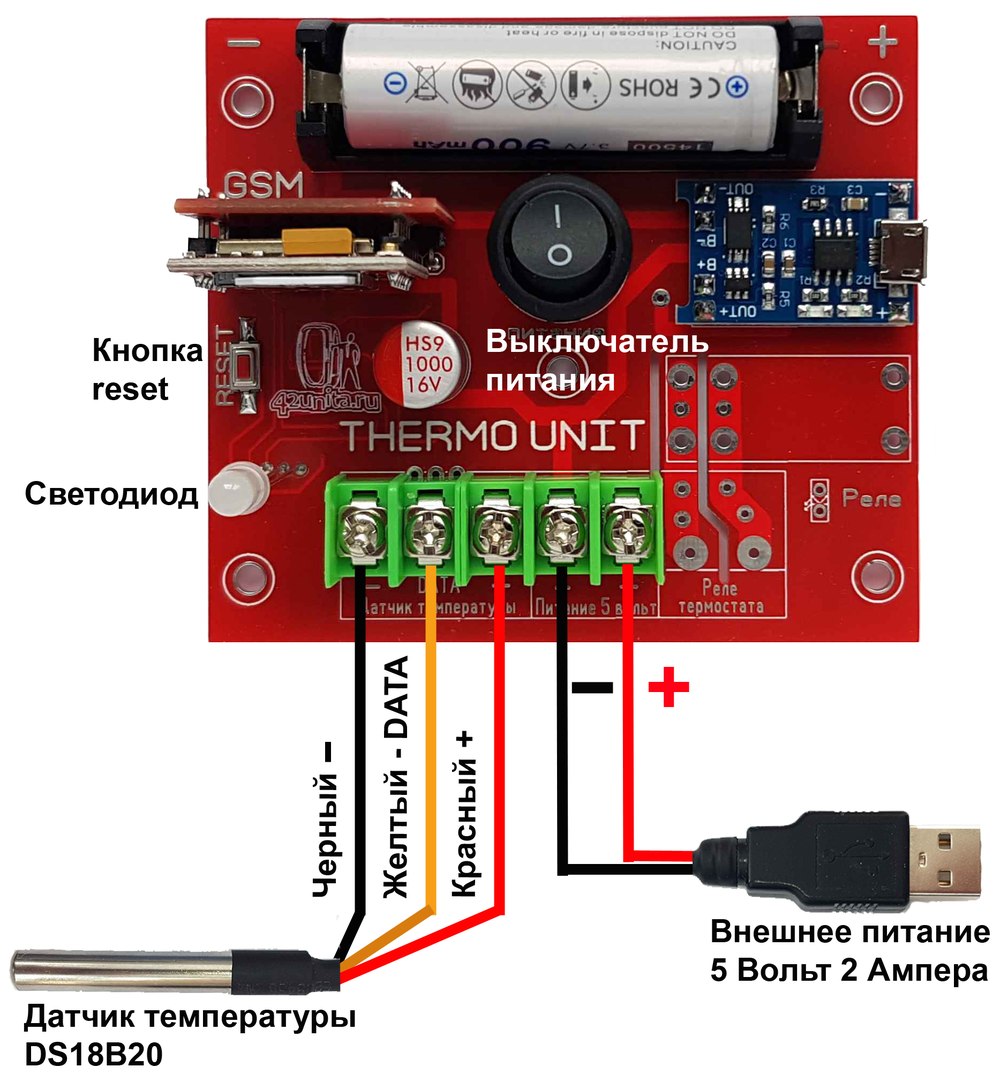 GSM-термометр THERMO UNIT, сигнализация пропадания сети 220В, коммутация 16А, Li-Ion АКБ