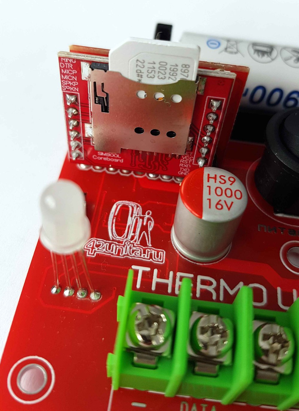 На плате термометра установлен цветной светодиод который выполняет функцию индикатора температуры. Синий - температура ниже установленной границы, зеленый - температура в установленных границах, красный - температура выше установленной границы, фиолетовый – отсутствует датчик температуры, белый - отсутствует сотовая связь.