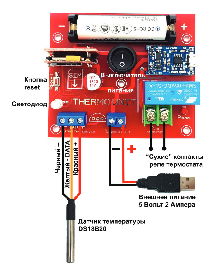 Питание GSM-термостата осуществляется от любого источника питания с напряжением 5 Вольт и выходным током не менее 2 Ампер (не входит в комплект). Устройство имеет встроенный съемный литий-ионный аккумулятор типоразмера 18650.