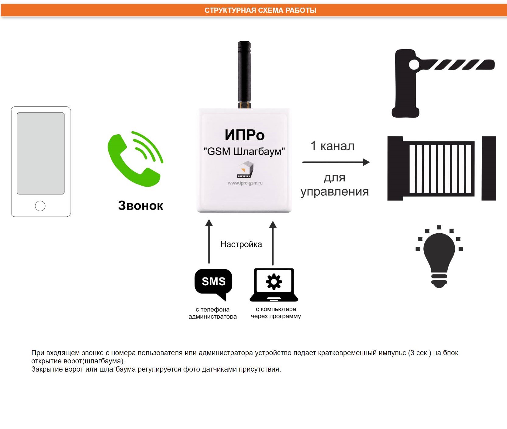 Gsm модуль "ИПРО шлагбаум" предназначен для управления с помощью мобильного телефона: