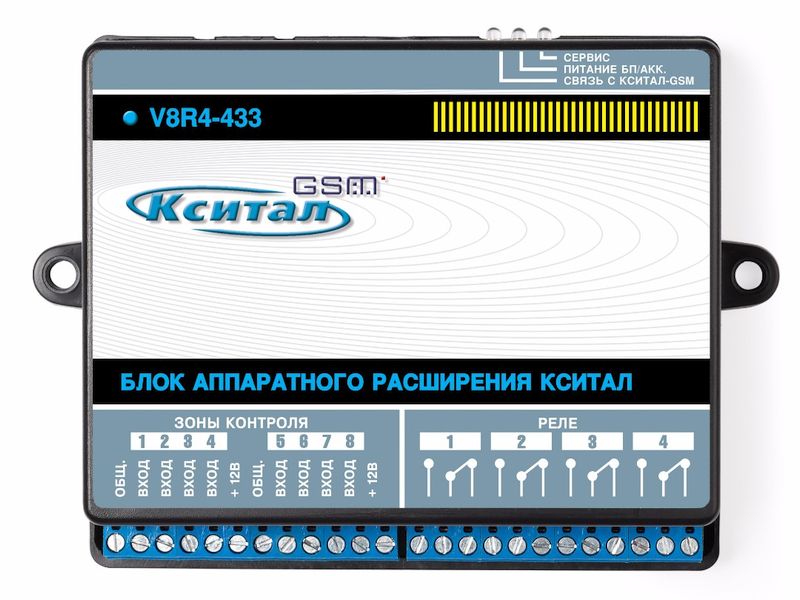 Беспроводной блок аппаратного расширения КСИТАЛ V8R4-433 предназначен для работы в составе системы КСИТАЛ GSM и позволяет увеличить количество зон контроля системы и количество реле для управления исполнительными устройствами