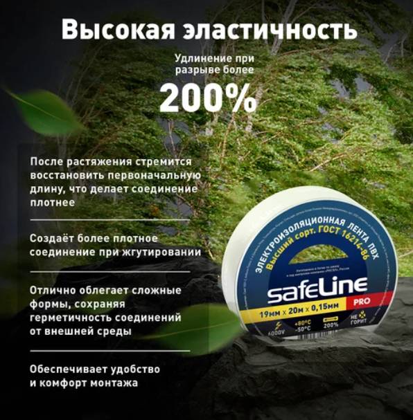 Изолента черная SafeLinePRO представляет собой поливинилхлоридную пленку, разрезанную на полосы шириной 19 мм и длиной 20 м. На одну ее сторону нанесено клеевое покрытие, которое и играет ключевую роль в предназначении этого расходного материала. Значительной особенностью изоляционной ленты является ее термостойкость — она не поддерживает горение. Диапазон температур использования изолент довольно широк –50...+80 °С.