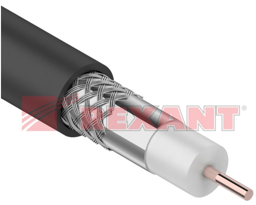 Коаксиальный кабель RG-6U (75 Ом) черный REXANT по структуре представляет собой два проводника – внутренний и внешний, расположенных соосно и разделенных изолирующим диэлектриком. Центральный проводник – однопроводная омедненная жила окружен изоляцией из вспененного полиэтилена. Экран, наложенный на сердечник, имеет дополнительную алюминиевую оплетку из 48 нитей для обеспечения его электрической непрерывности.