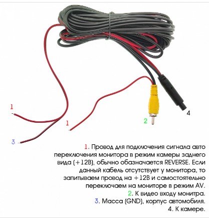 Комплектация кабель RCA+питание-5.5м, камера, инструкция на Русском