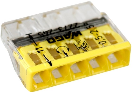 Элетромонтажные экспресс-клемы WAGO 2273-245 позволят безопасно и быстро соединить 5 проводов между собой (алюминиевые и медные как одножильные, так и многожильные). Достаточно просто вставить жилу кабеля или провода в клемму и самозажимной контакт надежно зафиксирует соединение. Диаметр соединяемых проводов должен составлять в сечении от 0,5 до 2,5 мм2. Удобные тестовые гнезда, прозрачный корпус для визуального контроля и смотровое окно для проверки защиты от касаний делают работу более безопасной. Наличие пасты обеспечивает надёжную изоляцию контакта