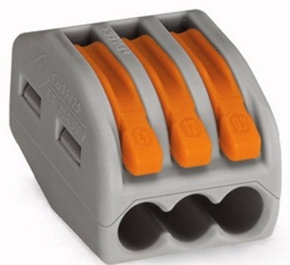 Соединительная многоразовая клемма на 3 проводника с плоско-пружинным зажимом предназначена для подсоединения до 3 зачищенных проводников тонкого сечения ( от 0,08 мм² до 4 мм², одно- и многожильных до 2,5 мм²).