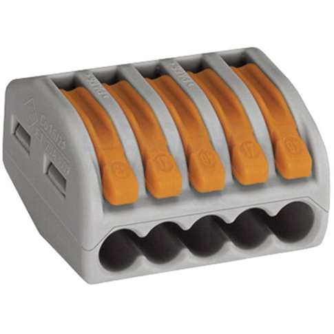 Соединительная многоразовая клемма на 5 проводников с плоско-пружинным зажимом предназначена для подсоединения до 3 зачищенных проводников тонкого сечения ( от 0,08 мм² до 4 мм², одно- и многожильных до 2,5 мм²).