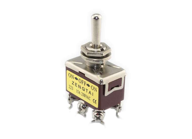 Тумблер 250V 10А (6c) (ON)-OFF-(ON) двухполюсный (KN-223) предназначен для коммутации электрических цепей переменного тока напряжением до 250В. Такая разновидность переключателей применяется на лицевых панелях в качестве комплектующих изделий различного электрооборудования (в измерительных приборах, блоках питания, электроустановках на различных производствах, легковых и грузовых автомобилях, поездах и многих других местах). Отличительной особенностью тумблера является перекидной переключатель, принцип действия которого основан на его перемещении в одну из позиций. Для переключения в нужное положение требуется приложить некоторые усилия. Монтаж осуществляется без применения винтов на плоских панелях толщиной от 0.8мм до 4мм. Подключение контактов осуществляется с помощью винтов.