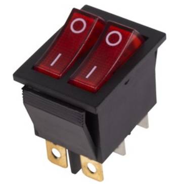 Выключатель клавишный 250V 15А (6с) ON-OFF красный с подсветкой ДВОЙНОЙ предназначен для коммутации электрических цепей переменного тока напряжением до 250В. Клавишные (Рокерные) выключатели применяются в качестве комплектующих изделий различного электрооборудования (в сетевых фильтрах и удлинителях, аудио-оборудовании, блоках питания, электроустановках на различных производствах и многих других местах). Такой клавишный переключатель имеет два положения и две клавиши, что позволит раздельно коммутировать контактные группы. Принцип действия основан на перемещении клавиши в одну из позиций. Для переключения в нужное положение требуется приложить некоторые усилия на клавишу. Монтаж осуществляется без применения винтов на плоских панелях толщиной от 0.8мм до 3мм. Подключение контактов осуществляется плоской клеммой 6.6мм либо с помощью пайки.