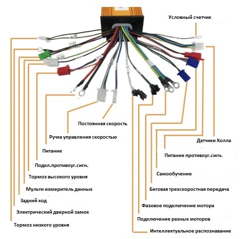 Контроллер для мотор-колеса 500W (650W), синусный. При подключении к мотору с датчиками Холла имеет на выходе  чистый синусоидальный ток ,что позволяет мотору работать плавнее и менее шумно. При отсутствии датчиков ток имеет модифицированный синус с "прямоугольными волнами".