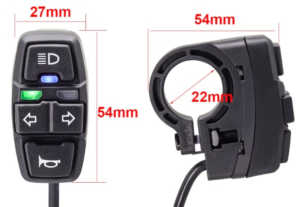 Переключатель DK336-2 позволяет управлять вкл./выкл. освещения, поворотников и звукового сигнала. Подходит для электросамокатов, электровелосипедов, мотоциклов.