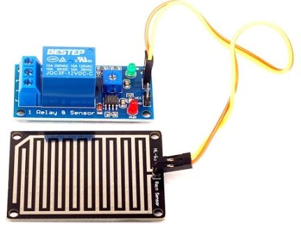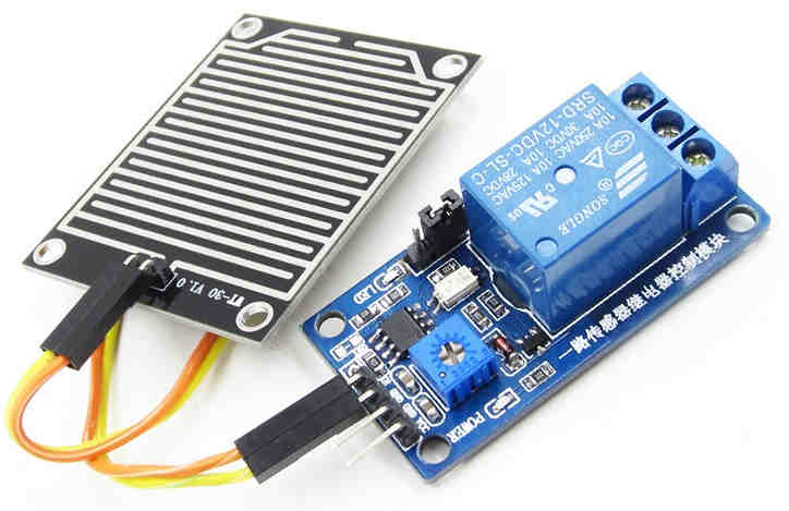 Добрый день! Когда капли воды попадают на дорожки датчика, между ними возникает сопротивление, которое считывается реле и оно включается в работу. Реле будет находиться во включенном состоянии до тех пор, пока с датчика не сойдет жидкость. Чувствительность срабатывания зависит от положения переменного резистора установленного на плате.