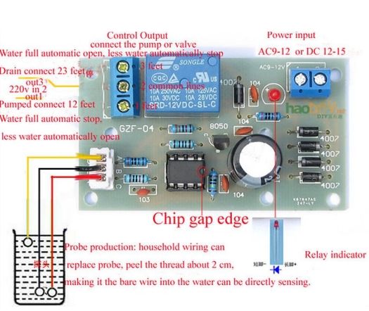Для данной платы не требуется как таковой датчик уровня. Достаточно обычной проводки. Если зачистить на нужных уровнях по 2 см проводку реле будет срабатывать.