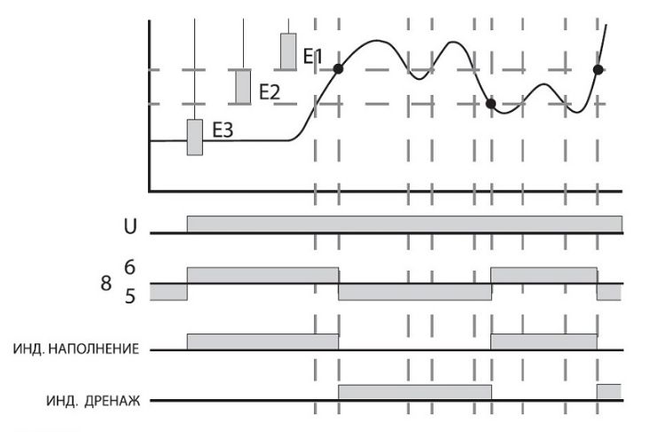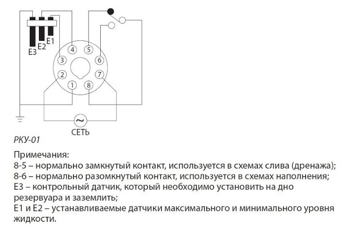 • Реле имеют переключающие контакты, что позволяет использовать их для работы как в режиме наполнения, так и в режиме слива.