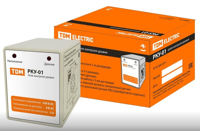 РКУ-01 реле контроля уровня, 1 насос/1 резервуар/2 уровня/3 датчика 230V 8Ц (без датчиков) TDM
