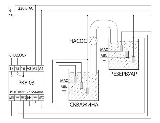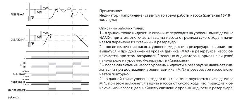 • РКУ-03 используется для перекачки жидкости из скважины в резервуар и производит защитное отключение насоса в режиме сухого хода (снижение уровня жидкости в скважине ниже минимального).
