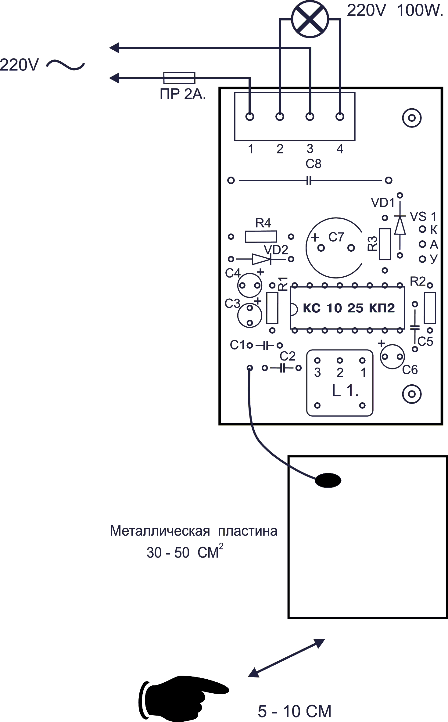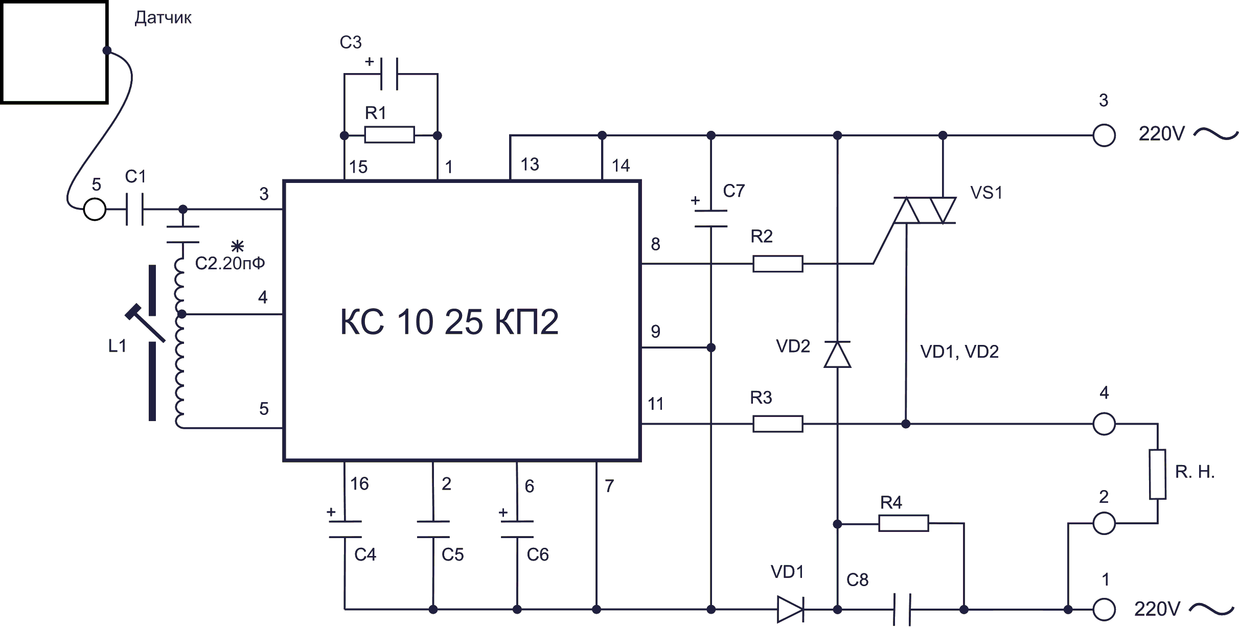Ёмкостное реле собрано на специализированной микросхеме КС1025КП2. Данная микросхема имеет полный набор необходимых компонентов: генератор синусоидальных колебаний, детекторы синусоидальных колебаний, источник опорного напряжения, дифференциальный усилитель, стабилизатор напряжения, пороговая схема, схема защиты, схема управления симистором.