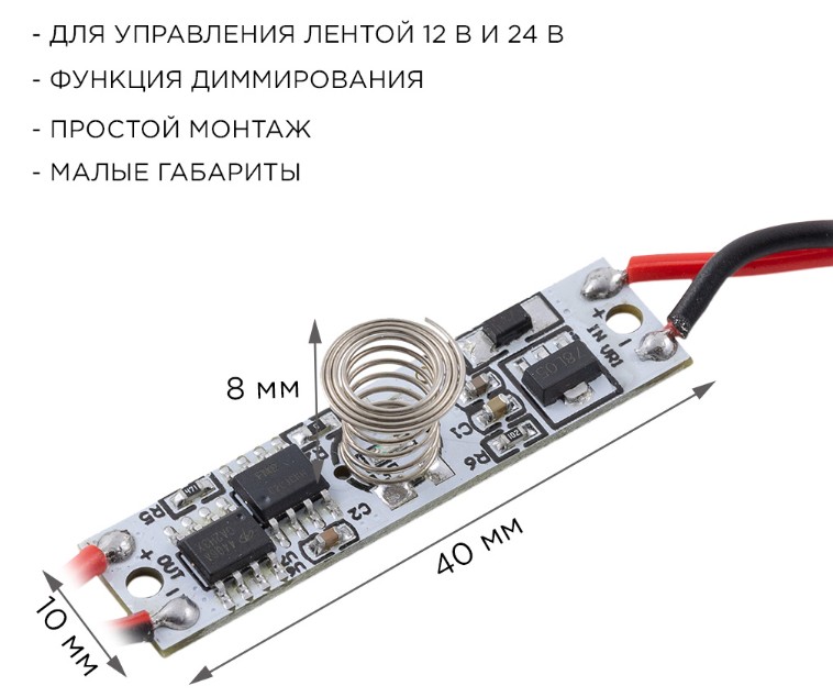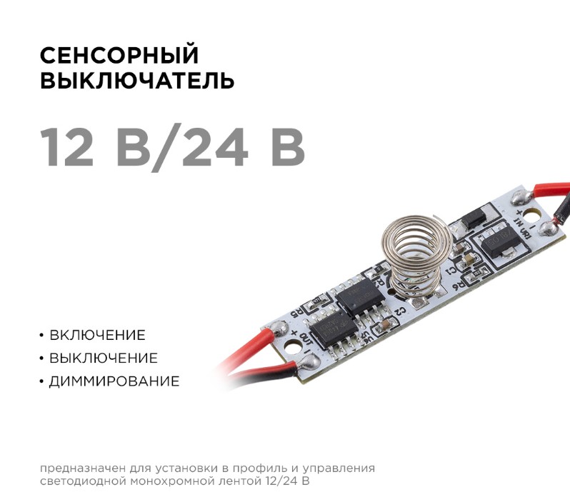 Сенсорный выключатель с функцией диммирования 04-42 предназначен для управления светодиодной монохромной лентой 12/24 В. Выключатель устанавливается в алюминиевый профиль высотой 6 мм. Короткое касание включает и выключает светодиодную ленту, длинное касание регулирует яркость свечения. Одно из преимуществ данного изделия заключается в возможности работать как от напряжения 12 В, так и 24 В, а значит его можно использовать со светодиодными лентами с соответствующим напряжением. Важно отметить, что в зависимости от того, с каким напряжением предстоит работать устройству, будет отличаться и максимальная мощность нагрузки, которую можно подключить к нему. Так, при напряжении 12 В максимальная нагрузка будет равна 36 Вт, а при напряжении 24 В уже 72 Вт. Это значит, что к данному изделию вы можете подключить в два раза больше светодиодной ленты 24 В. Встраиваемый выключатель имеет размеры 40х10х8 мм. Степень защиты от пыли и влаги соответствует стандарту IP20, что подразумевает установку устройства в сухом, проветриваемом помещении.