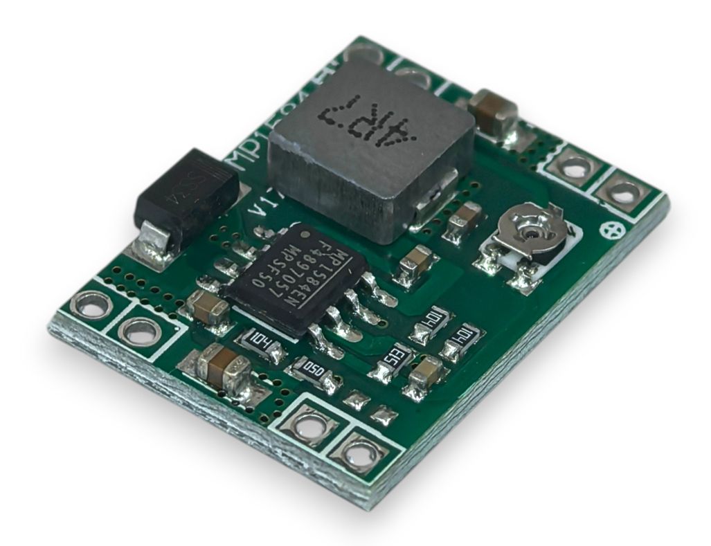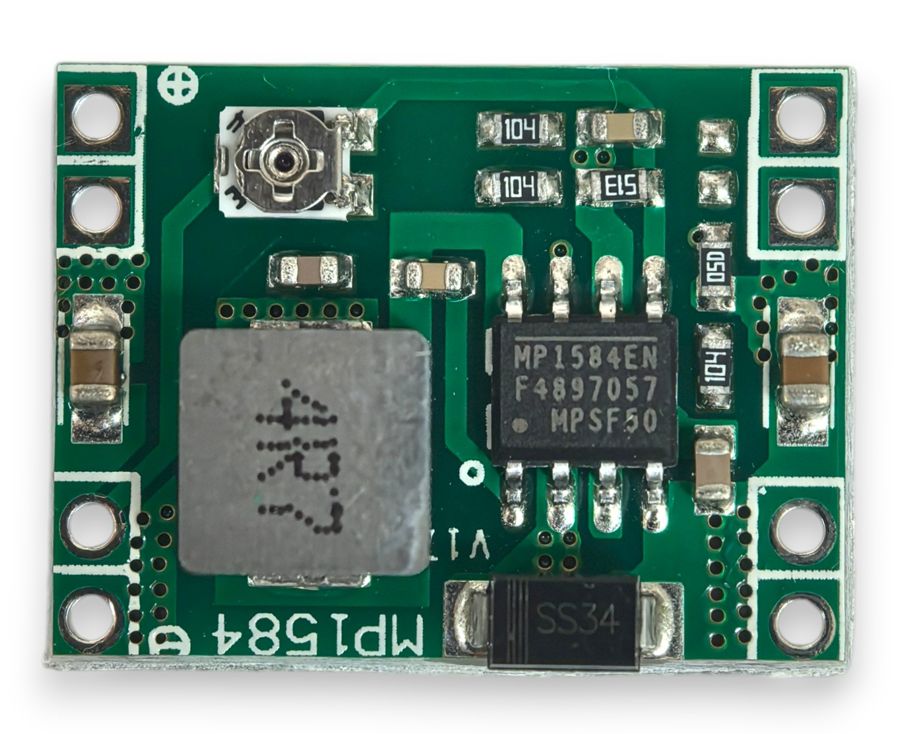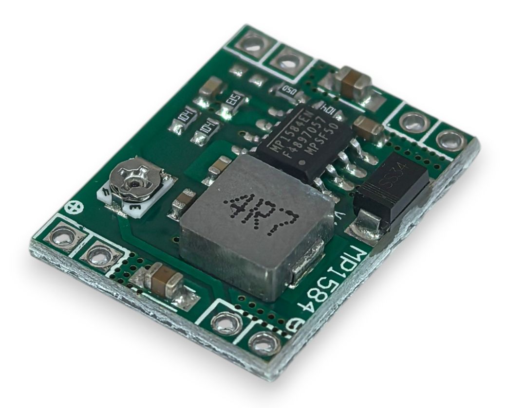Питание цепей устройств нагрузочным током более 1.5А ощутимо нагревает крошечный корпус микросхемы регулятора и другие силовые компонеты платы. Длительное превышение рабочей температуры MP1584EN требует добавления элементов охлаждения (желательна установка медного радиатора с большой площадью рассеивания).