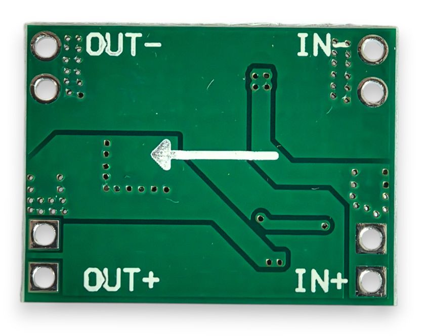 Каждый вывод в группах контактов входного IN+/IN- и преобразуемого напряжений на выходе OUT+/OUT- продублирован двумя соседствующими отверстиями, подготовленными к припайке проводов или разъёмов. Шаг выводов обеих групп имеет расстояние 2.54 мм, благодаря чему плата регулятора совместима с элементами беспаячного макетирования электронных проектов. Крепёжных отверстий не предусмотрено, монтаж платы предполагает применение клеющих материалов, таких как двусторонний скотч, термоклей, и т.д.