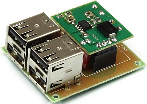 Данный конструктор, собранный вместе с модулем RP235M, представляет собой понижающий стабилизатор напряжения до 5 Вольт и имеющий 4 выхода USB. Предназначен для преобразования и стабилизации бортового напряжения автомобиля до 5 Вольт и вывода его с помощью разьёмов USB на внешние устройства. Это позволит питать или заряжать до 4 разных устройств, например мобильный телефон, МР3 плеер, планшетный компьютер и т.д.