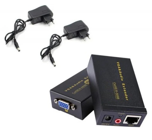 VGA удлиннитель активный - Extender до 100 метров по обыкновенной витой паре RJ45 категории Cat5e или Cat 6. Состоит из 2-х частей - приемника и передатчика. К приемнику подключаем устройство от которого поступает сигнал а к передатчику - монитор или дисплей для приема сигнала между приемником и передатчиком для удлиннения сигнала используется кабель витая пара до 100метров. Передача VGA и аудио сигнала с высоким разрешением 1920x1200 по одному проводу на длинные расстояния с этим устройством теперь не проблема.