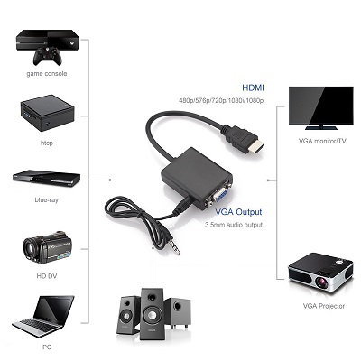 Компактный видео-аудио переходник HDMI (M) - VGA (F) + jack 3,5 преобразует видео поток HDMI в VGA сигнал + 3.5 mm аудио.