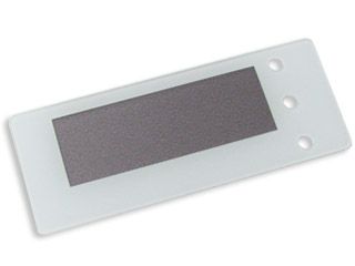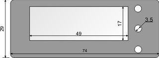 Лицевая панель черная, внешние размеры - 74 х 29 мм, матовое внутреннее окно 49 х 17 мм, скотч 3M.
