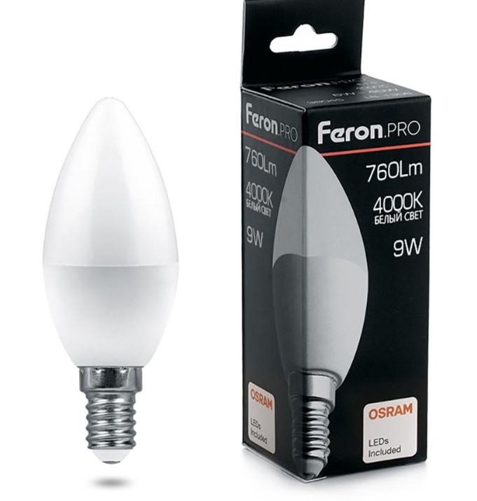 Лампа светодиодная Feron PRO C37 E14 9W(760lm) 4000K 4K матовый 100x37 OSRAM LED LB-1309