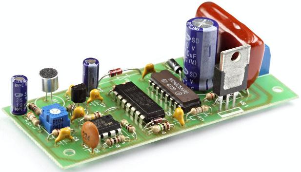 Устройство собирается на печатной плате размером 85х35 мм. После сборки необходимо проверить правильность установки: компонентов, цоколевки транзистора, микросхем и симистора, полярности электролитических конденсаторов. После включения схемы необходимо подстроечным резистором R4 установить чувствительность микрофона.