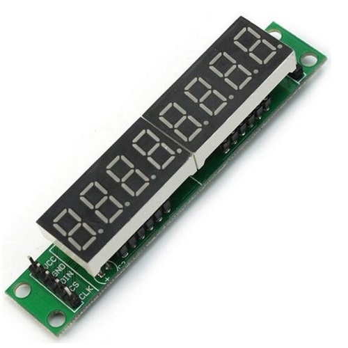 Модуль семи сегментных светодиодных индикаторов на 8 знакомест с точками. Модуль построен на базе микросхемы MAX7219 (драйвер 8-ми разрядного светодиодного индикатора с последовательным интерфейсом).