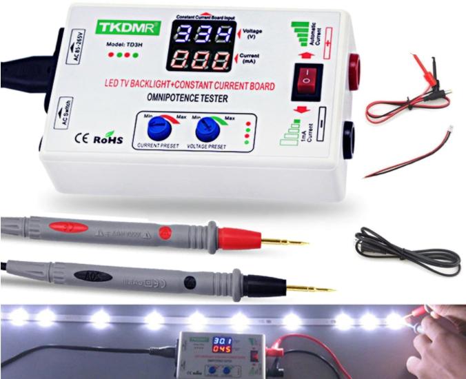 Универсальный LED тестер - TKDMR TD3H с автоматической и ручной регулировкой напряжения и тока (плавное нарастание тока). С помощью данного светодиодного тестера можно проверять светодиодную подсветку телевизоров/мониторов, включая отдельные линейки и светодиоды, а также светодиодные матрицы, полосы, COB светодиоды, люстры и лампочки.