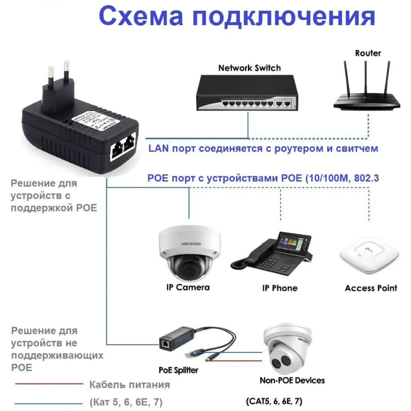 PoE-инжектор совмещенный в одном корпусе с блоком питания. Выходное напряжение 48 Вольт позволяет подавать питание по кабелю "витая пара" различным устройствам, поддерживающим стандарт PoE 802.3af/at.