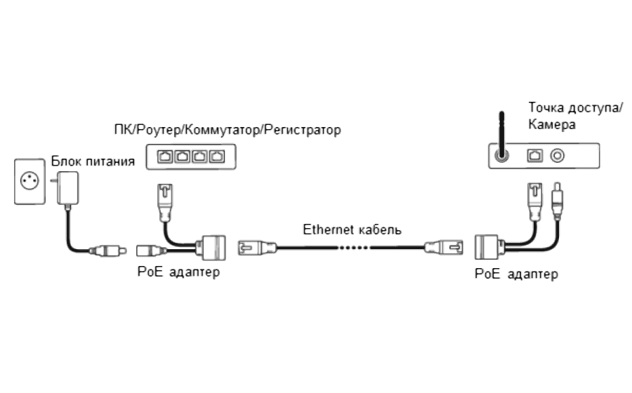 Инжектор включается в сеть Ethernet вилкой RJ-45 и соединяется с блоком питания стандартным джек-разъемом , в порт RJ-45 инжектора подключается линия данные+питание. На противоположной стороне линии данные+питание сплиттер выполняет обратное преобразование — разделяет сигнал и питание.